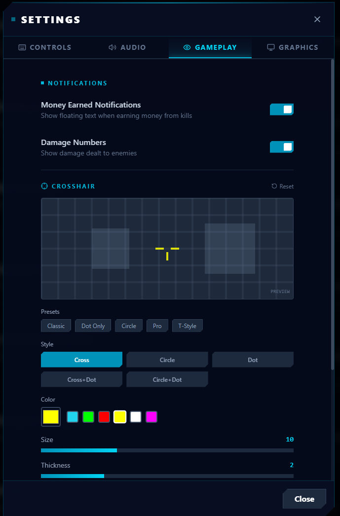 Customize your crosshair exactly to your liking! Choose from 5 styles, adjust color, size, thickness, and more. Find it in โ๏ธ Settings โ ๐๏ธ Gameplay โ ๐ฏ Crosshair.